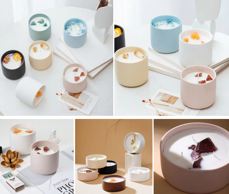 - Ceramic jars: Great for hand-poured, high-end candles. Best paired with soy or beeswax for a natural, clean burn.
